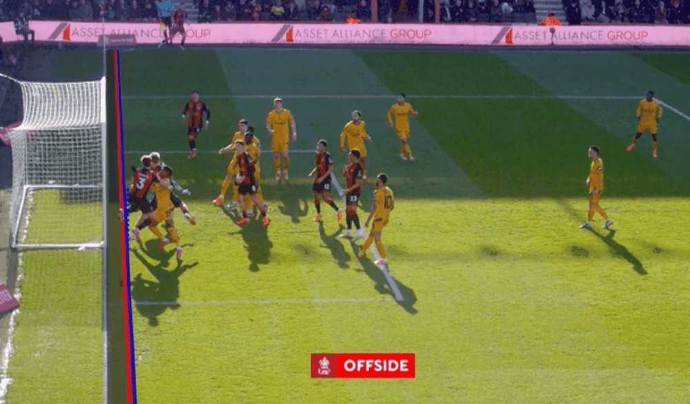 据报道,当值裁判组首先审查了伯恩茅斯球员并未手球和犯规,随后半自动越位技术审核是否存在越位情况。