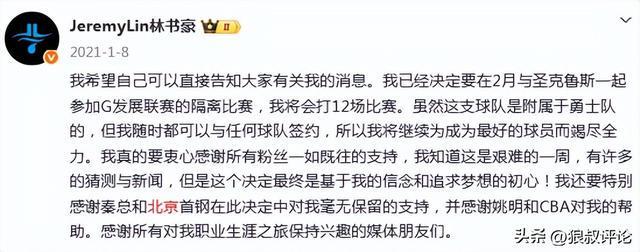 我已经决定要在2月与圣克鲁斯一起参加G发展联赛的隔离比赛,我将会打12场比赛。虽然这支球队是附属于勇士队的,但我随时都可以与任何球队签约,所以我将继续为成为最好的球员而竭尽全力。我真的要衷心感谢所有粉丝一如既往的支持,我知道这是艰难的一周,有许多的猜测与新闻,但是这个决定最终是基于我的信念和追求梦想的初心!我还要特别感谢秦总和北京首钢在此决定中对我毫无保留的支持,并感谢姚明和CBA对我的帮助。感谢所有对我职业生涯之旅保持兴趣的媒体朋友们。