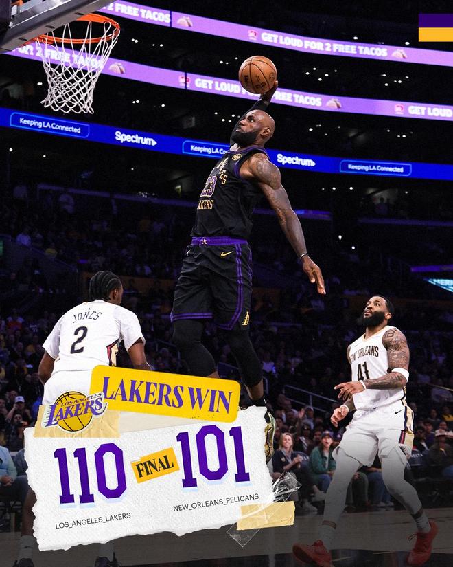 里夫斯三分不中,锡安强攻得分,东契奇制造犯规两罚全中,湖人队仍领先4分。锡安突破单打丢球,斯马特右侧0度角投中三分,第四节还有1分30秒时湖人队以105-98领先。鹈鹕队再叫暂停,锡安突破进攻,球被斯马特打掉,东契奇右翼三分命中,湖人队以108-98领先10分。穆雷迅速回应打3分,里夫斯两罚全中,穆雷三分三不沾,墨菲尝试出手,斯马特把球拍掉,湖人队最终以110-101获胜。