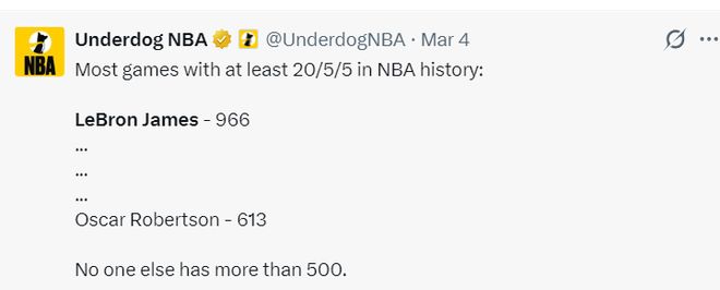 对阵鹈鹕拿到21+7+7后,詹姆斯生涯已经拿到966场20+5+5继续刷新历史第一,奥斯卡-罗伯特森613场20+5+5历史第二,其余的球员没有一人达到500场。勒布朗-詹姆斯有多项数据将达成历史第一,这就是GOAT的魅力,历史最长的河果然名不虚传。