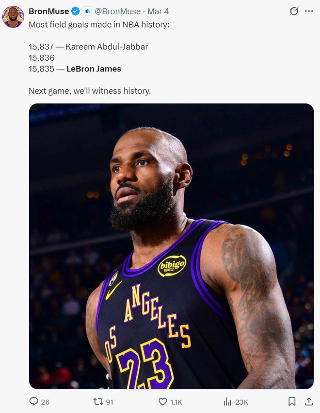 除此之外詹姆斯运动战进球已经15835个,他距离贾巴尔的15837个只差2个,距离超过贾巴尔只差3个,下一场比赛就能超过成功成为历史第一。
