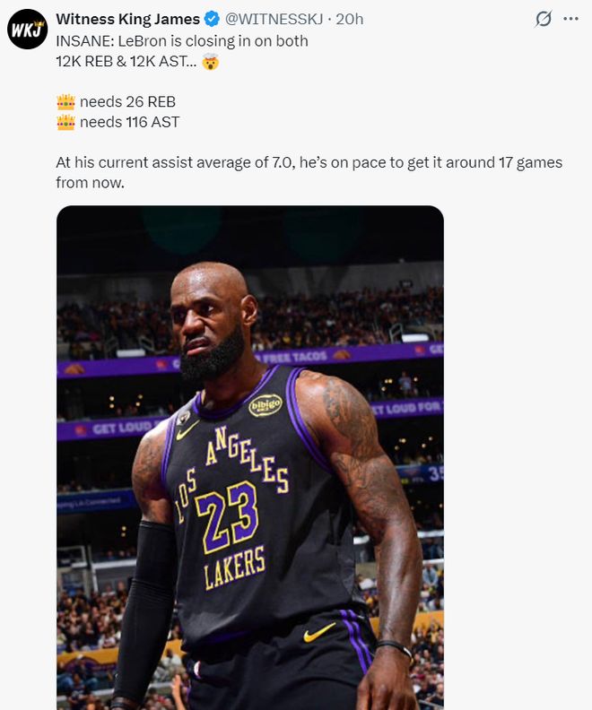 41岁的勒布朗也会迎来多项里程碑的时刻,他距离12000篮板、12000助攻只差26个篮板与116次助攻,按照詹姆斯场均7个助攻来看他只需要17场比赛就超过这两里程碑。